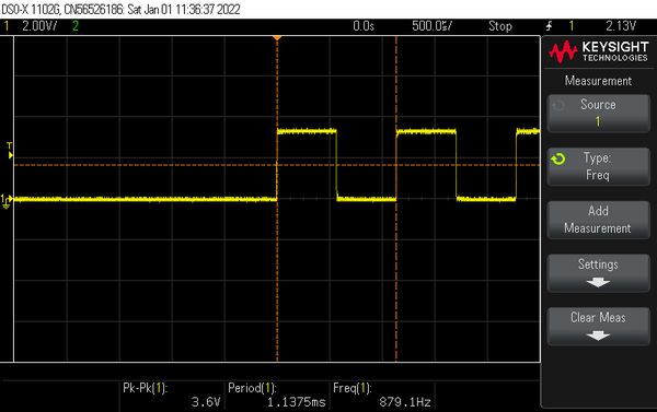 Start and end frequency are each 1 Hz. The end frequency is reached in one step and the two frequencies each consist of one period and the chirp is executed once. The duty cycle is 50%. At the end of this chirp there is a 2 sec. wait. But because I call the function repeatedly in the main loop of the program, the pulse train also appears repeatedly in the screenshot from my scope (see below).